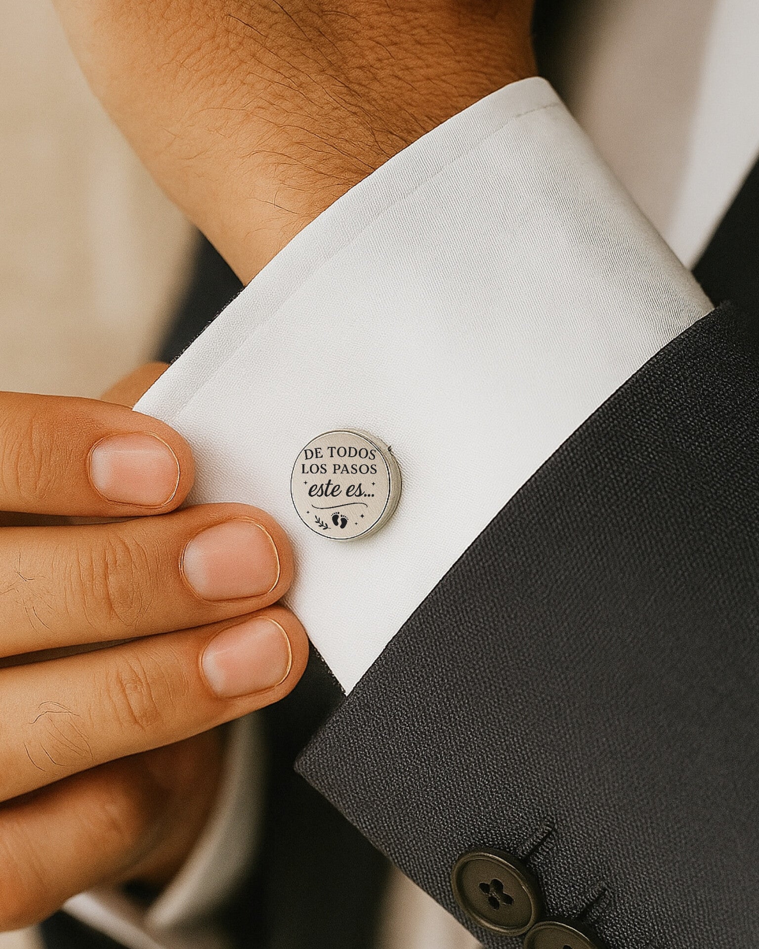 Fabricados en acero inoxidable de alta calidad, con acabado plateado brillante, estos gemelos combinan estilo, durabilidad y emoción. Cada pieza tiene un diámetro de 17 mm y se personaliza con la frase, nombre o fecha que elijas, creando un recuerdo único que tu hermano podrá conservar y lucir con orgullo.